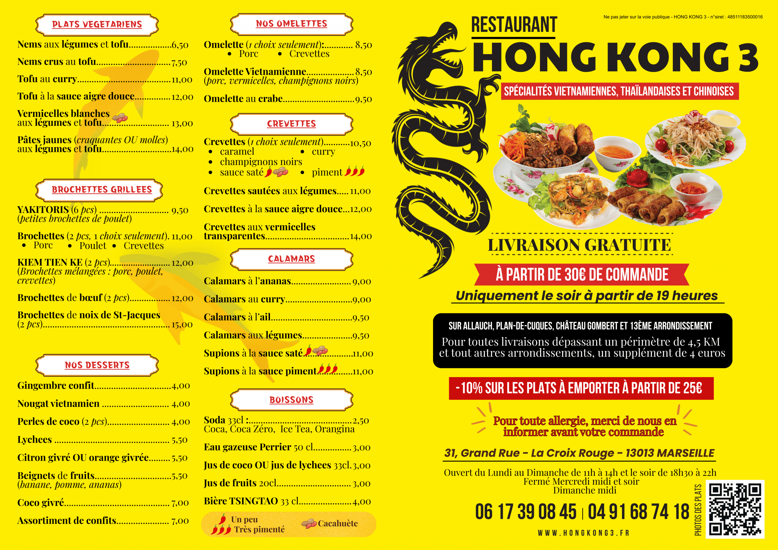 Le restaurant asiatique Hong-Kong 3 vous accueille tous les jours de la semaine au 31 Grande Rue de la Croix rouge dans le 13ème arrondissement de Marseille pour déguster des spécialités vietnamiennes, thaïlandaises et chinoises dans une ambiance asiatique et conviviale.